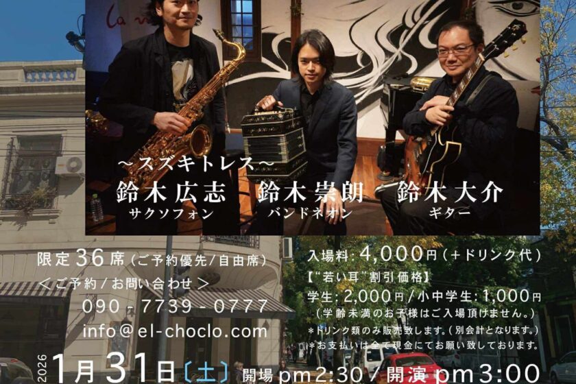出演:鈴木大介(gt) 鈴木広志(sax) 鈴木崇朗(bn)